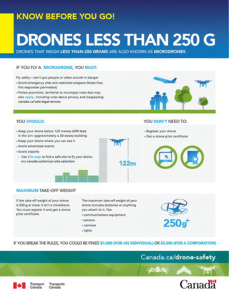 Transport Canada published new rules for flying drones in Canada on January 9, 2019. The rules no longer treat recreational and commercial drone pilots differently, but instead categorize operators as basic or advanced with different rules for each. The rules apply to drones between 250 grams (0.55 pounds) and 25 kilograms (55 pounds).