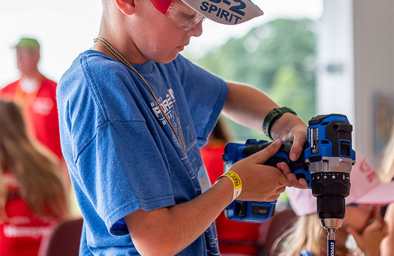 VAA President Susan Dusenbury said there are ample hands-on learning opportunities. “Simple things, like the basic components of an engine and how to use things like screwdrivers and drills. And we teach them how to make an electrical circuit with battery power, and a light will come on.” There’s even a table where kids can craft a cellphone holder from sheet metal, all under the guidance of VAA volunteers.