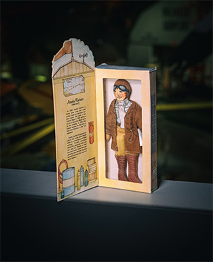 In 1979, more than 40 years after she made her historic solo flight across the Atlantic Ocean, Hallmark released an Amelia Earhart doll as the first doll in its “Famous Americans” series. The doll comes in a collectible box designed to look like a 1930s airport hangar. Inside the box is a brief bio of Earhart, and the doll displays Amelia wearing her trademark goggles and silk scarf. Although this doll was created long after Earhart’s disappearance, dolls created in her likeness were not uncommon during her lifetime. Bisque, paper, and celluloid aviator dolls were popular with children in America, Europe, and Japan.