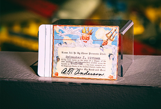 Back when a commercial flight was still an event to dress to the nines for, Pan American World Airways commemorated a passenger’s crossing the equator with a little memento. On April 25, 1948, Sylvester “Steve” Wittman was accepted into the “Empyrean Realm of His Exalted Majesty Jupiter Rex,” the same year his airplane Bonzo finished third at the National Air Races. “Crossing the line” ceremonies were common among sailors, with participants receiving a similar certificate from “Neptunus Rex” and sometimes his scribe, “Davy Jones.” Pan Am felt that its passengers making the same journey in the air deserved to be celebrated. While this certificate is small enough to fit in one’s wallet, others range in size from that of a greeting card to diploma size with much more elaborate artwork.