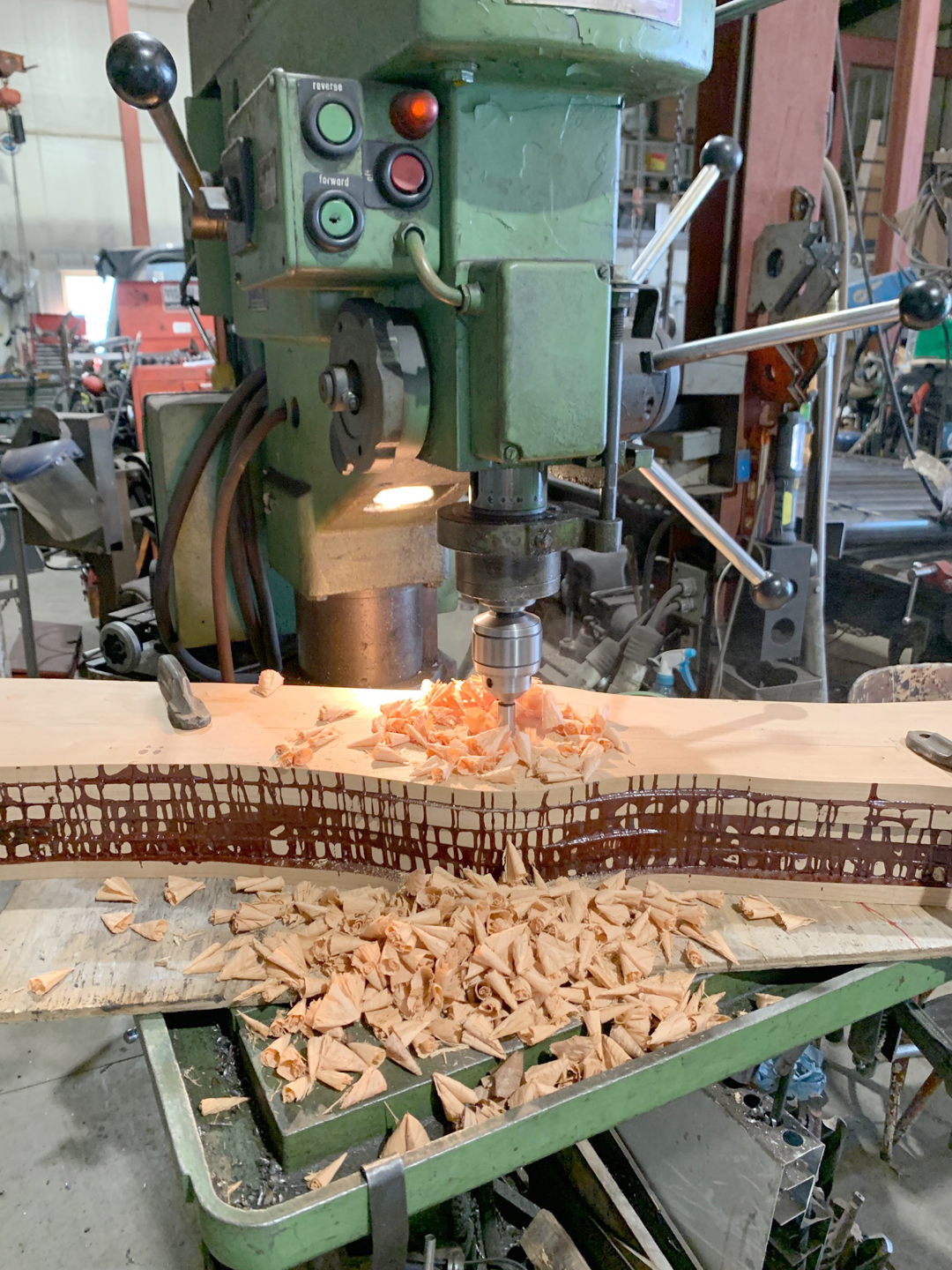 To drill the holes, we took the blank to Ray Robinson’s workshop. Due to the 4 1/8-inch-thick hub, the length to diameter ratio of the holes required some very accurate drilling. Ray’s shop has an excellent drill for that purpose. Thanks, Ray! Job done including the eight 3/8-inch bolt holes and the 2 ¾-inch center hole. A new Forester bit was purchased for the center hole. The hub of the pattern was used as our drill guide for the eight bolt holes.