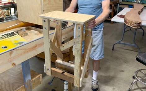 He took the bottom of his shop roll-around chair and used it as a rolling base, then added a platform on top which held the big, heavy blank at the same height as the band saw table. Worked great! Especially when Dave’s neighbor came over and lent us a hand. Job done again.