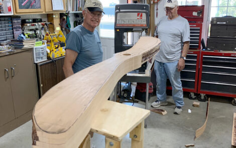 The other change at Dave’s to the blank involved trimming some excess wood from the blank so we could avoid having to remove this excess wood with the routing operation. Remember the key word is BIG! To do this we decided to use Dave’s band saw. But holding the 75-pound blank in the band saw appeared to be a daunting task. So, Dave came up with a rather clever solution.