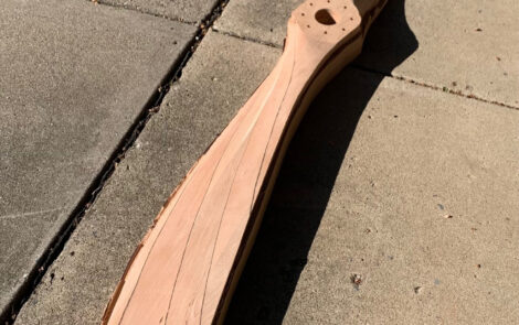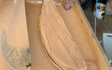 At the end of this phase I was left with two things. One, a nicely roughed in propeller and two, a bunch of chips. Two wheelbarrows full of chips! BIG prop! And it’s good to live in the country. I checked online and fresh chips are not good mulch, so out in the field they went along with the chips from the planing process. A big pile! The prop was now weighing about 19 pounds, so from the routing process alone there was more than 50 pounds of chips! And no friends with a hamster! Humpf‼ This routing and rough sanding took two weeks and more than 50 hours. Yep, from 75 pounds down to 19 pounds!