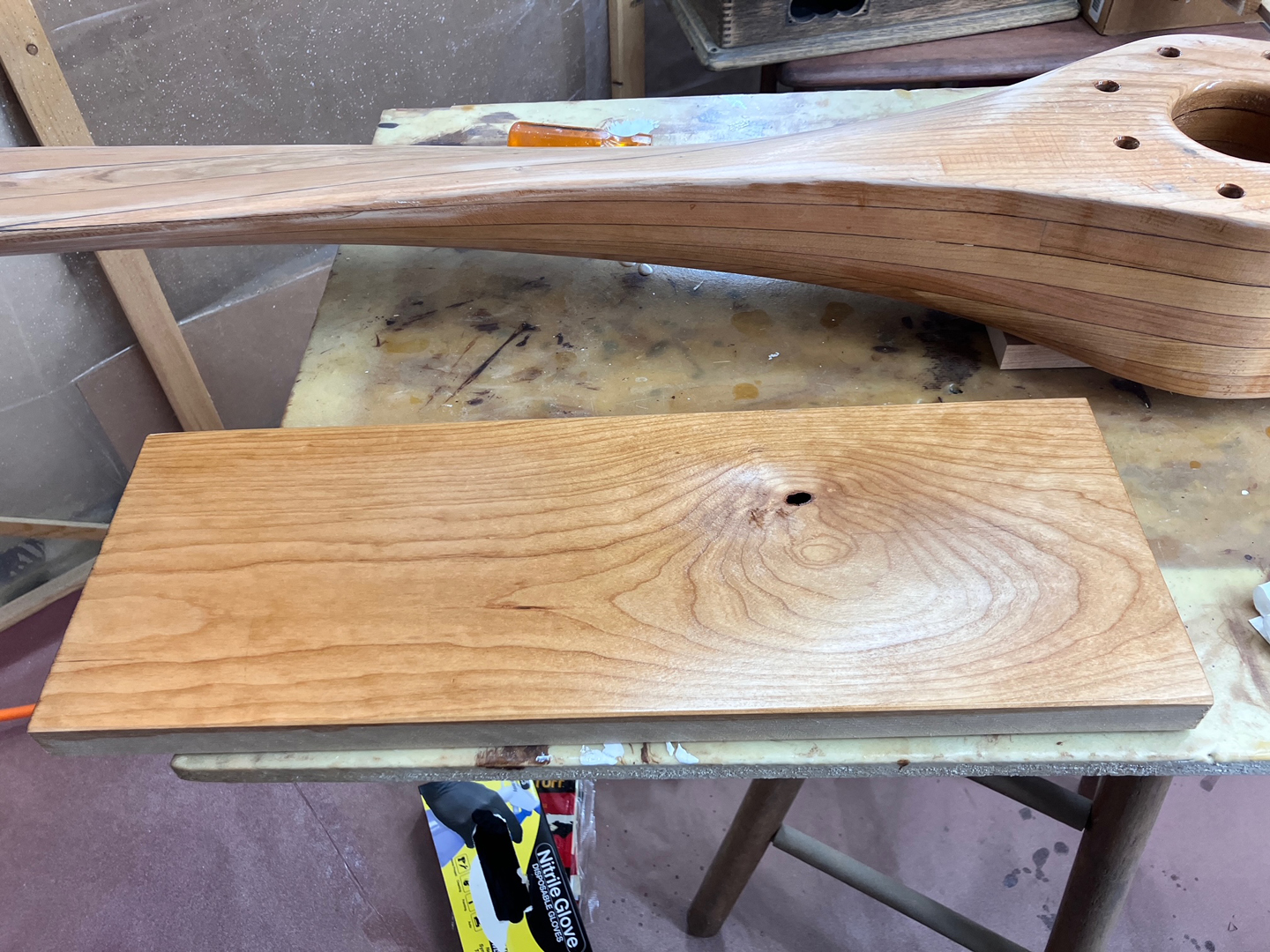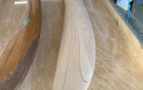 So a move from glossy to semigloss was decided upon. I consulted with Beth Grumstrup who is an excellent wood finisher. The resulting conversation with Beth was, should we spray or wipe. Yep, I said wipe. Beth was aware of a varnishing technique where the varnish was applied in a thinned condition many times by wiping the varnish on with a cloth. With the awkward shape of the big propeller and the issues of overspray and handling, the wiping technique was thought of as a possible good solution. Plus, the prop didn’t fit in the spray booth, BIG prop! Time now for a test. Below is a picture of the test panel and in the background the awaiting propeller sanded and ready for varnishing using the wiping technique.