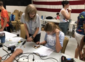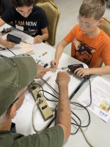 The four workshop seminars included Aviation Theory, in which the students learned the basics of aerodynamics, aircraft design, and operation; Electric Basics had each student constructing a light and buzzer circuit board including a chance to send Morse code messages; Wood Aircraft Construction, which gave each student the opportunity to construct their own wood wing rib teaching design theory, gussets, and gluing; and Sheet Metal Basics, which saw each student construct a metal cell phone holder or name tag using both driven and pulled rivets. Each seminar was designed to provide the kids with a tangible reminder of their effort that they can take home with them which taught a skill used in aircraft construction.