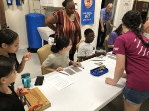 Each one-day workshop took place on a Saturday morning. Preregistered students and their parents were invited to be in place by 8:30 a.m., with the formal workshop starting at 9 a.m. We kept the curriculum the same for both of these sessions to learn the ropes as to what worked and what didn’t with the kids. Between 15 and 20 students were preregistered for each workshop. We had a target timeframe of four hours, including a short break where drinks and snacks were provided. Each seminar was to last 30 minutes with a signal to change to the next seminar station. Kids were given colored name tags to keep the groups together during this change. We arranged our hangar into five areas, a waiting area for parents, and then four hands-on seminar areas.