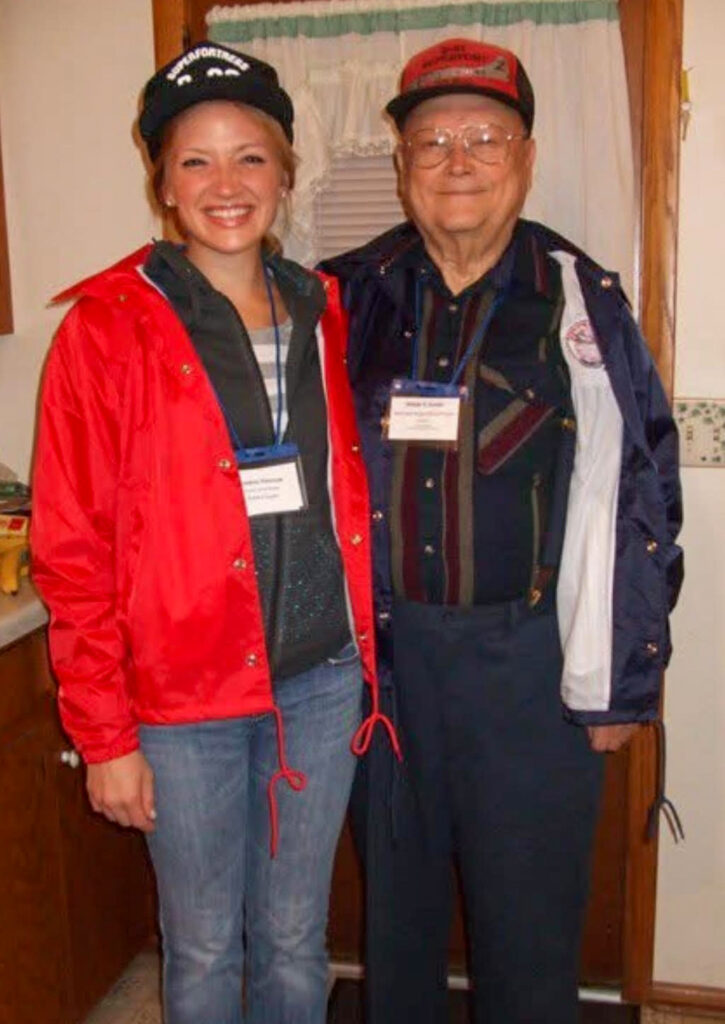 My dad did go on an Honor Flight with his granddaughter (my daughter), Lindsey. It was 2010, the year that a documentary was being made about the flight and they make a brief appearance in that film. We watched it at Miller Park in Milwaukee. Lindsey said that her grandpa showed his favorite photo of his wife, Miriam (Newport Beach, California, 1951) “all day to everyone!”