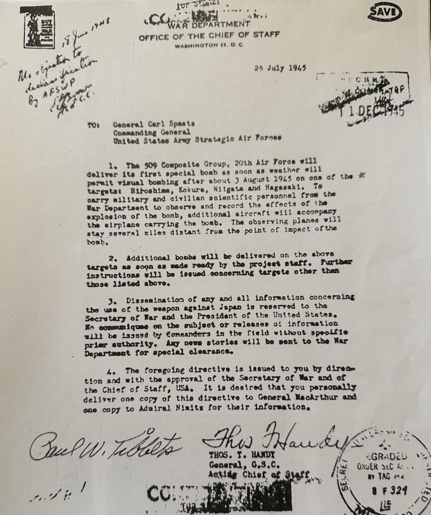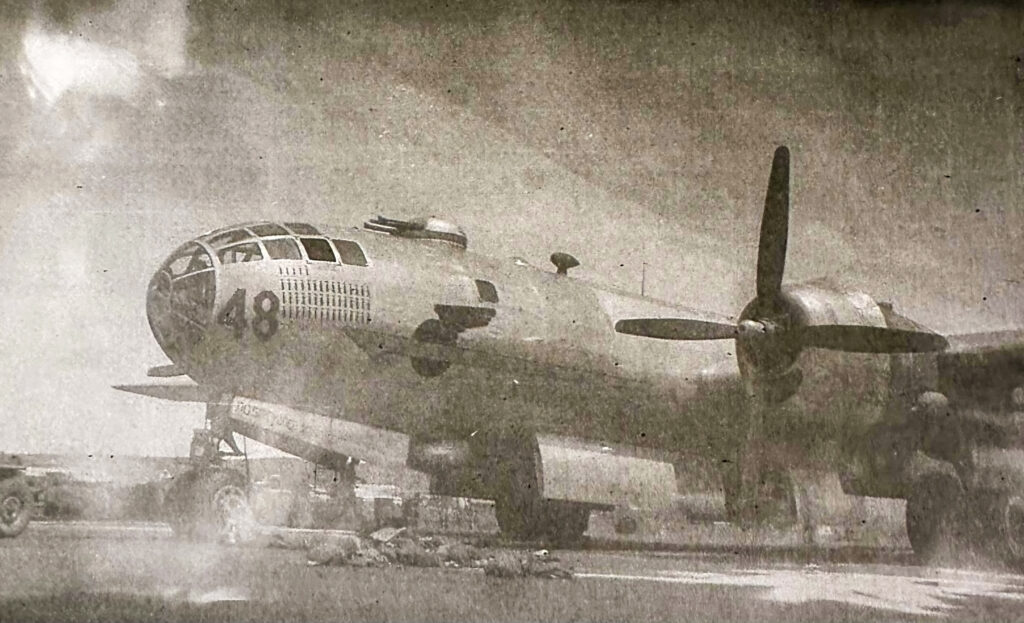 In wartime, the B-29 was capable of flight at altitudes up to 31,850 feet and speeds of up to 350 mph. This was its best defense because Japanese fighters could barely reach that altitude, and few could catch the B-29 even if they did attain that altitude. In summer of 1945 the decision was made to have the B-29 drop two atomic bombs over targeted cities on Japan’s mainland. At that time Japan, though hopelessly losing the war, did not believe in surrender and was preparing for a massive invasion by the United States and its allies. They were arming their citizens (by this time, mostly the elderly, women, and children) and training them to defend at all costs. This would have amounted to an enormous loss of life for not only the Japanese citizens, but for all of the army, air, and naval forces as well. As horrible as this decision seemed, it was the only solution for a quick ending to this prolonged conflict. The B-29 Enola Gay flown by Col. Paul Tibbets (whose signature is on the order), dropped the first bomb called Little Boy on Hiroshima on August 6,1945. Bockscar, flown by Maj. Charles W. Sweeney, dropped the second bomb called Fat Man on Nagasaki three days later. Conventional bombing raids on Japanese cities continued even after the atomic bombings, increasing the ongoing pressure on Japan to surrender. On September 2, 1945, the Japanese Empire surrendered, ending the war. After the Japanese surrender, the next order was to strip the airplanes down to bare bones and send every available airplane to Japan to pick up our prisoners of war. These men were living skeletons and were the top priority. Nobody was going anywhere until those men were out and on their way home. The number of deaths among POWs held by the Japanese was notably higher than in POW camps run by Germany or Italy. Of the roughly 28,000 American POWs held by Japan, more than 11,000 died in captivity, with more dying after rescuing due to the extreme physical and mental conditions they were battling.