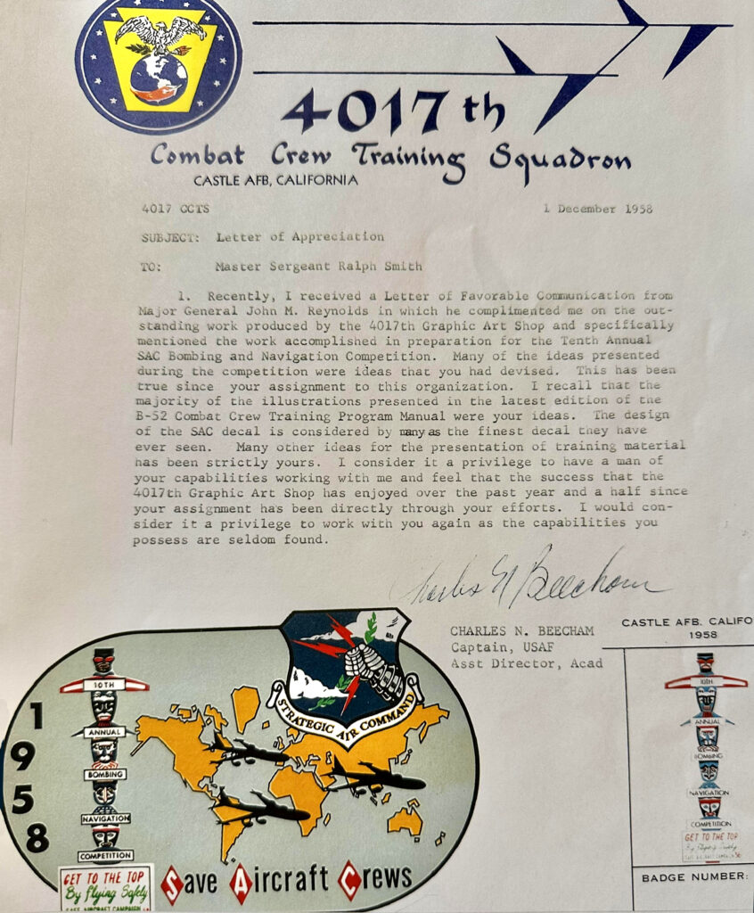 Ralph has often said that being a part of this conflict was his greatest life accomplishment. As an only child he really enjoyed the teamwork and general camaraderie of his gunner crew and stayed in touch with each of them, eventually outliving them all. He reenlisted, staying in the military until retirement. During the Korean War he was stationed at March Air Force base in Riverside, California. In the late 1950s he was stationed at Castle AFB, California, and was selected to work in the graphic arts department. Ralph was assigned to design a new decal for the Air Force which earned him a letter of special recognition.