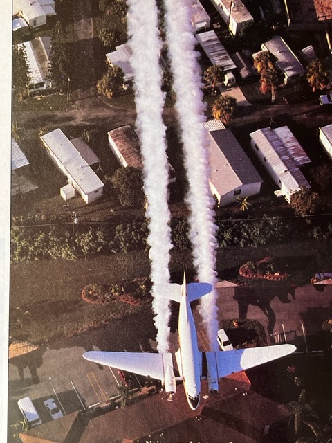 I had just recently moved to Florida’s Gulf Coast and was enjoying some early morning salt water fishing near New Pass on Fort Myers Beach when I heard the distinct sound of big radial engines approaching. As I looked up in the direction where I thought the aircraft were coming from, I didn’t see a thing, but the rumble kept getting louder and louder. Quite suddenly, a flight of four DC-3s in formation appeared over the treetops, literally, spewing smoke at no more than 100 feet off the ground! They flew directly over my head with a glorious, thundering roar from their radial engines then disappeared as quickly as they had arrived. To most non-aviation-oriented people, that would have been a jarring and frightening few seconds of sensory overload, but I relished the moment as my adrenaline pumped. After a few more low passes, each farther away from my location, they climbed out and headed northeast toward the mainland. As I packed up my fishing gear and headed for a hot breakfast, I remembered hearing about this outfit from my local FBO, but I’d never seen them in action until that morning; they were from the Lee County Mosquito Control District based out of Buckingham Field, originally a WWII Army Air Corps B-24 and B-17 training base just east of Fort Myers, and their mission was to kill adult mosquitos.