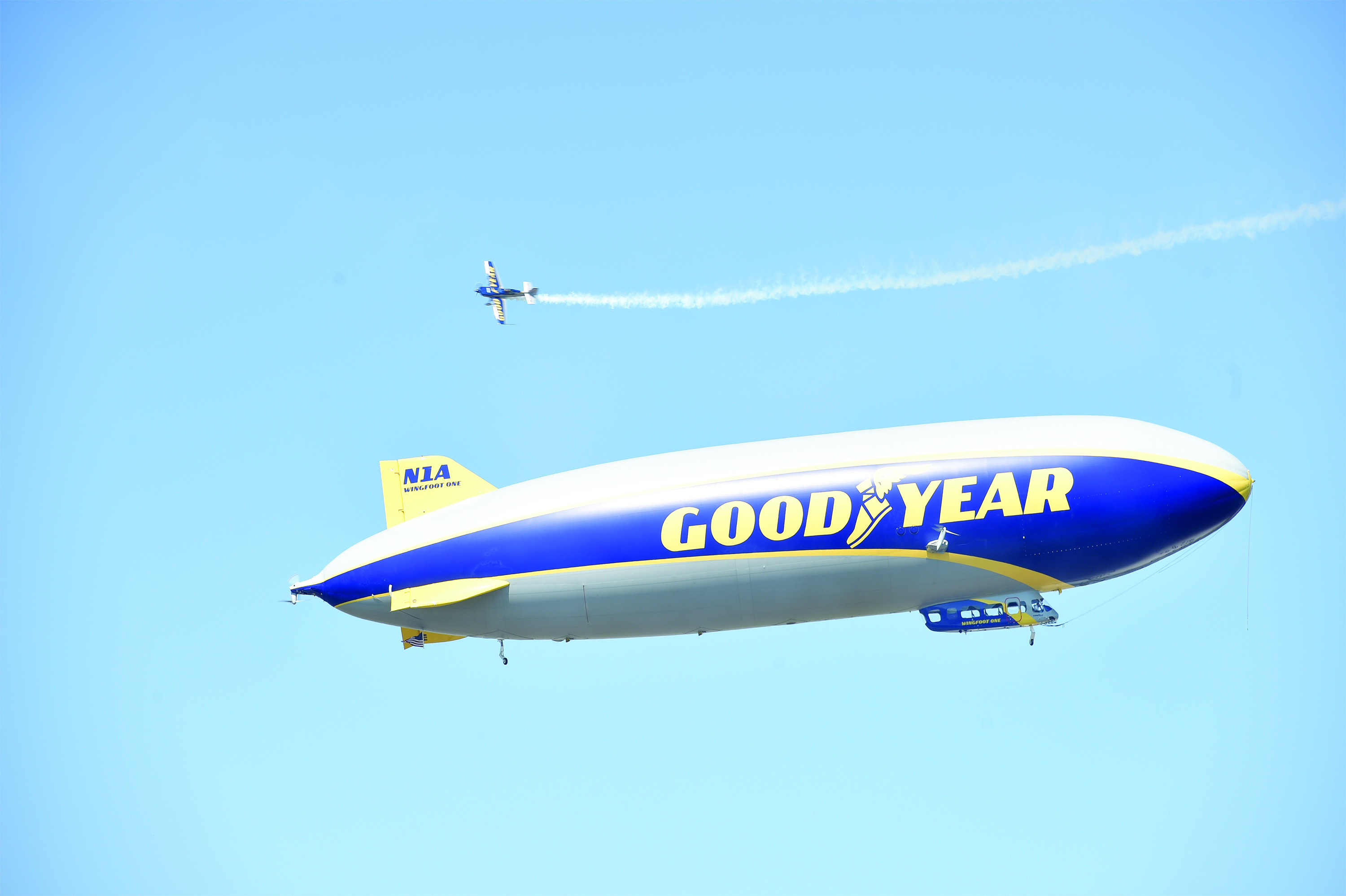 This year, two of the Goodyear NT (new technology) airships — Wingfoot One and Wingfoot Two — are in attendance in a salute to the 100th anniversary of Goodyear’s airship operations. There are three Goodyear blimps in the United States; Wingfoot Three is in for maintenance. To honor the heritage of the program, Wingfoot One is flying a livery inspired by the original Pilgrim. In 1925, Pilgrim became the world’s first commercial nonrigid airship that used helium.