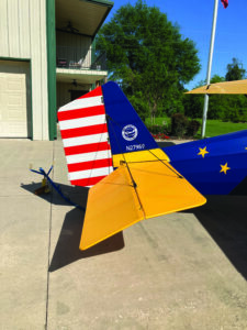 New sheet metal forward of the rear cockpit and tail fairings were replaced with designs that allowed easy access to the innards. Learning sheet metal work was a challenge, but I had excellent help. Fuselage was covered with Oratex fabric. I chose Oratex because I do not like painting. With Oratex you glue it, shrink it, and you’re done. I couldn’t find anybody locally who had installed Oratex. It requires a different mindset, and as the instructions say, “Forget everything you know about installing polyester.” So I hired a factory-trained installer, Oliver Straten, to help. It was well worth the extra expense. I even covered a lot of the sheet metal with Oratex. The all-wood wing structures were in excellent shape, only requiring some shiny yellow paint. The yellow stars sprinkled along the fuselage are vinyl cut on a Cricut machine. My wonderful wife was helpful when it came to trimming the cockpits.