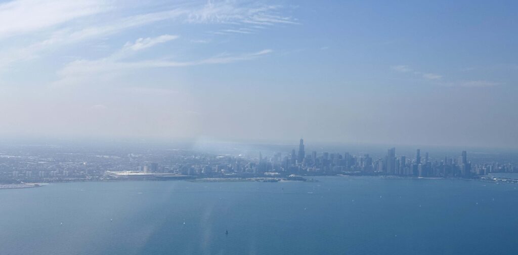 Routing took us around Lake Michigan to the south. Cloud deck from here to Gary saw us above the clouds at 6,500 feet for the first time. Holes on the other side got us back down under. Passing Chicago there was an active TFR around Wrigley, which had us over two miles offshore at 1,000 feet. Chatting with Chicago ATC, we were told “The TFR is more of a suggestion, just don’t dawdle.” Didn’t know “dawdle” was part of the ATC script wording. Oh yeah, that view, more of a shadowy silhouette with the smoke haze.