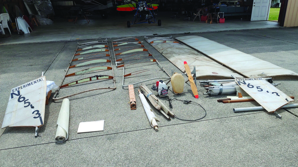John’s Icarus II is now in a hangar rented by MULA members from EAA Chapter 77 in Flushing, Michigan. Don and I unpacked and inventoried the components of this historic aircraft. Yes, it was a registered aircraft, N65131, before Part 103 rules. It was amazing how light and flimsy the wing panels seemed to be. Along with the airframe, we received all the drawings and prints for both the airframe and powerplant package. John also sent the original fabric used for making dresses. It’s amazing that the direct-drive McCulloch MAC-101 go-kart engine and tiny prop would get anything into the air.